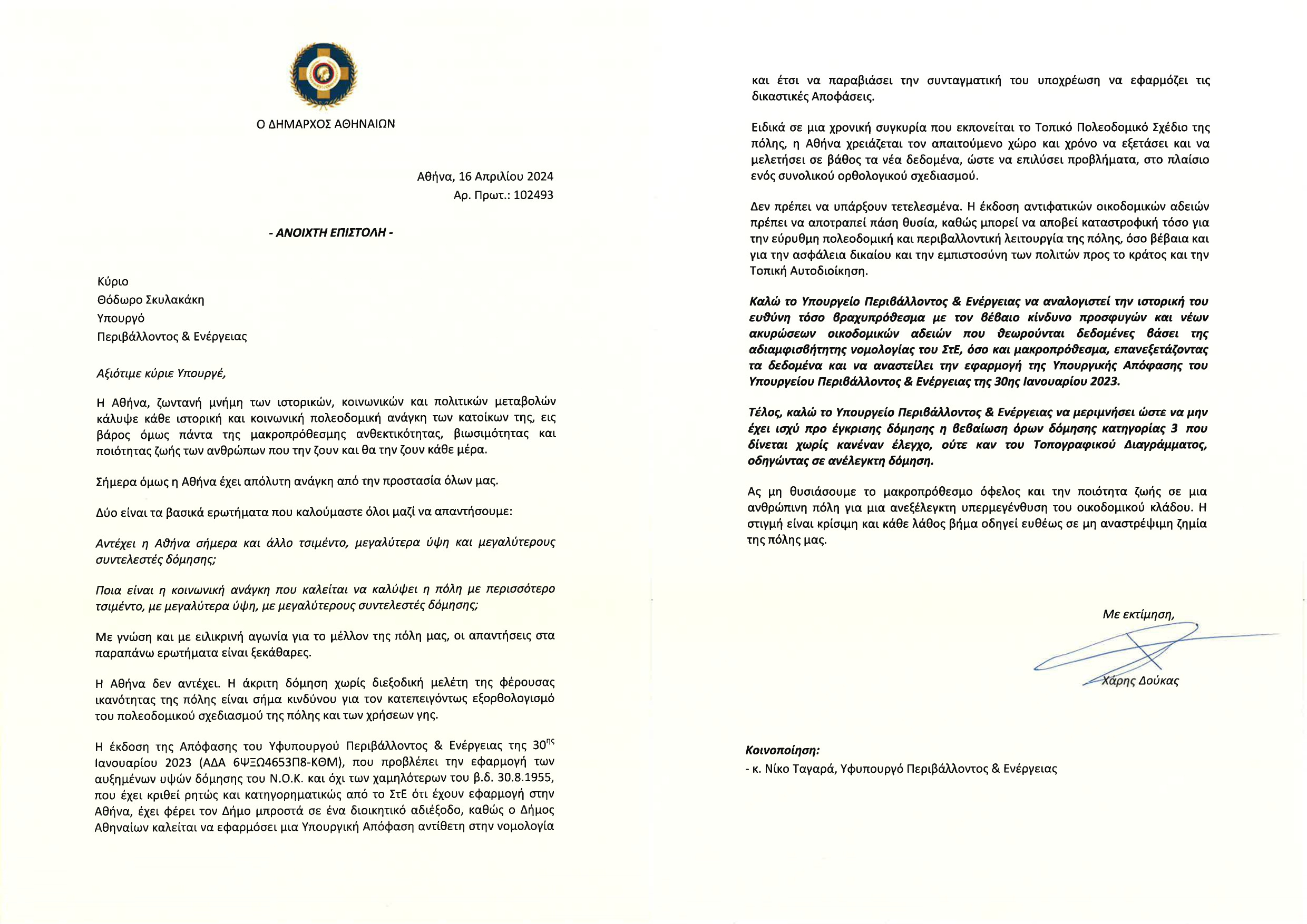 Η έκδοση της Απόφασης του Υφυπουργού Περιβάλλοντος & Ενέργειας της 30ης Ιανουαρίου 2023 (ΑΔΑ 6ΨΞΩ4653Π8-ΚΘΜ), που προβλέπει την εφαρμογή των αυξημένων υψών δόμησης του Ν.Ο.Κ. και όχι των χαμηλότερων του β.δ. 30.8.1955, που έχει κριθεί ρητώς και κατηγορηματικώς από το ΣτΕ ότι έχουν εφαρμογή στην Αθήνα, έχει φέρει τον Δήμο μπροστά σε ένα διοικητικό αδιέξοδο, καθώς ο Δήμος Αθηναίων καλείται να εφαρμόσει μια Υπουργική Απόφαση αντίθετη στην νομολογία και έτσι να παραβιάσει την συνταγματική του υποχρέωση να εφαρμόζει τις δικαστικές Αποφάσεις.