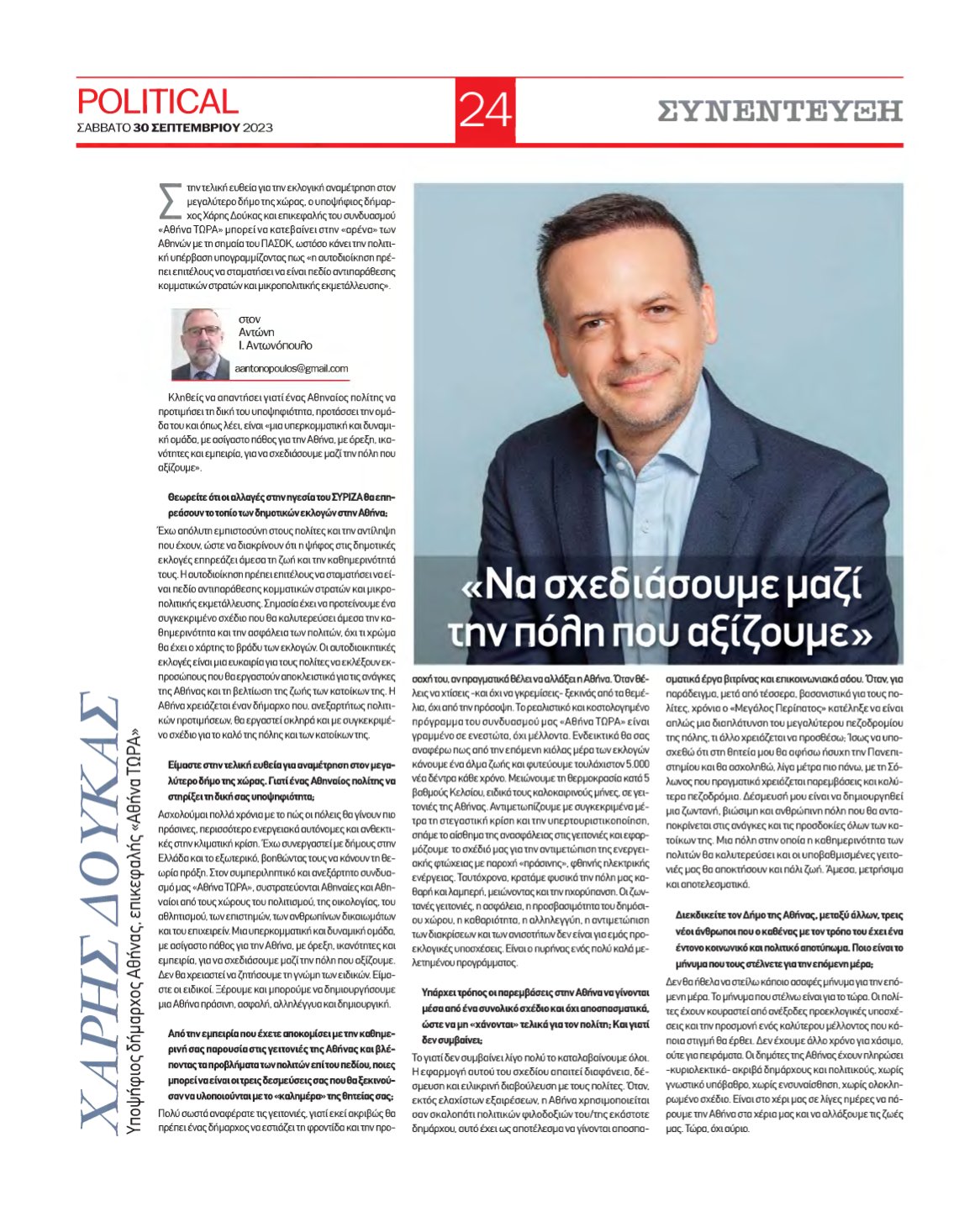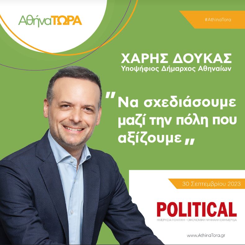 Στην τελική ευθεία για την εκλογική αναμέτρηση στον μεγαλύτερο δήμο της χώρας, ο υποψήφιος δήμαρχος Χάρης Δούκας και επικεφαλής του συνδυασμού “Αθήνα ΤΩΡΑ” μπορεί να κατεβαίνει στην “αρένα” των Αθηνών με τη σημαία του ΠΑΣΟΚ, ωστόσο κάνει την πολιτική υπέρβαση υπογραμμίζοντας πως “η αυτοδιοίκηση πρέπει επιτέλους να σταματήσει να είναι πεδίο αντιπαράθεσης κομματικών στρατών και μικροπολιτικής εκμετάλλευσης”. Κληθείς να απαντήσει γιατί ένας Αθηναίος πολίτης να προτιμήσει την δική του υποψηφιότητα, προτάσσει την ομάδα του και όπως λέει, είναι “μια υπερκομματική και δυναμική ομάδα, με ασίγαστο πάθος για την Αθήνα, με όρεξη, ικανότητες και εμπειρία, για να σχεδιάσουμε μαζί την πόλη που αξίζουμε”.