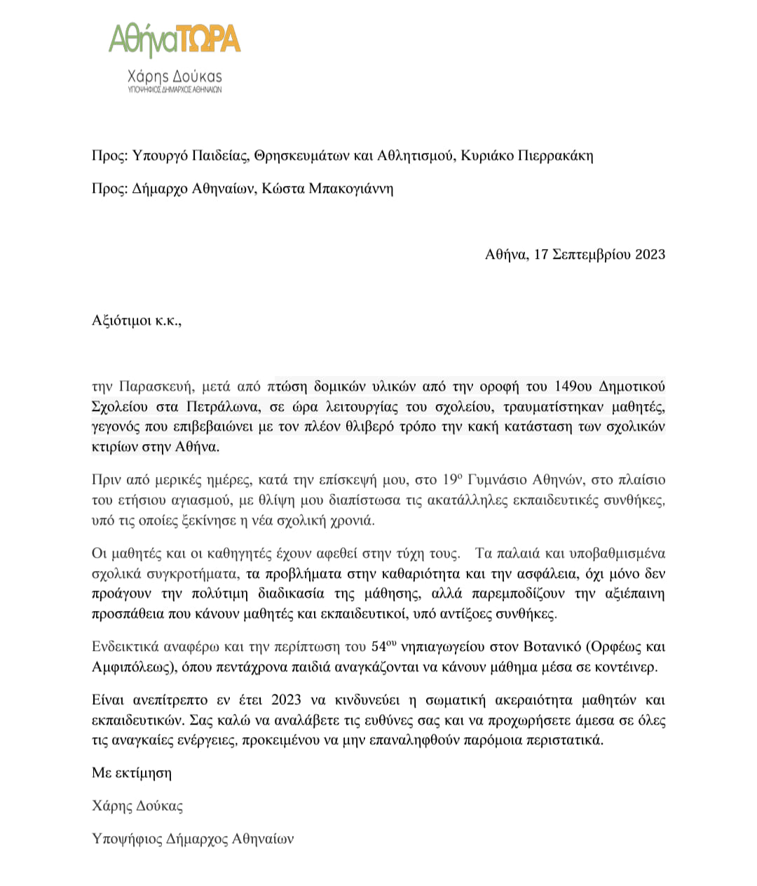 Την Κυριακή στείλαμε επιστολή στον Υπουργό Παιδείας και στον Δήμαρχο Αθηναίων για την απαράδεκτη κατάσταση σε ορισμένα σχολεία της Αθήνας. Περιμένουμε την απάντησή τους.