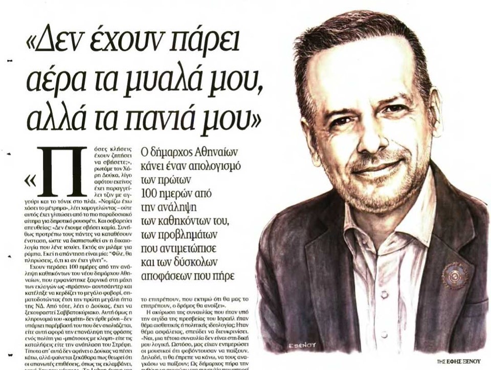Εχουν περάσει εκατό μέρες από την ανάληψη καθηκόντων του νέου δημάρχου Αθηναίων, που εμφανίστηκε ξαφνικά στην μάχη των εκλογών ως «πράσινο» αουτσάιντερ και κατέληξε να κερδίζει το μεγάλο φαβορί, σηματοδοτώντας έτσι την πρώτη μεγάλη ήττα της ΝΔ. Από τότε, λέει ο Δούκας, έχει να ξεκουραστεί Σαββατοκύριακο. Αυτή όμως η κληρονομιά του «κομήτη» δεν ήρθε μόνη -δεν υπάρχει παρέμβασή του που δεν σχολιάζεται, είτε αυτή αφορά την επανάληψη της φράσης ενός πολίτη για «μπάτσους με γκλοπ» είτε τις καταλήψεις είτε την ανάπλαση του Στρέφη. Τίποτα απ’ αυτά δεν αφήνει ο Δούκας να πέσει κάτω, αλλά φαίνεται ξεκάθαρα πως θεωρεί πως οι απανωτές επιθέσεις, όπως τις εκλαμβάνει, κακό δεν του κάνουν: «Το Luben έκανε μια ωραία, χιουμοριστική αφίσα με Μάο, Λένιν, Μαρξ και μένα, με λεζάντα “κόκκινος Δούκας”. Φτάσαμε σε σημείο και κάποιος που δεν ασχολείται να λέει πως κάπου έχουν ξεφύγει οι άνθρωποι». Είναι όμως, όντως «κόκκινος» ο Δούκας; «“Κόκκινος”; Αντιθέτως, είμαι “πράσινος” παντού: είμαι οικολόγος, ΠΑΣΟΚ και Παναθηναϊκός».