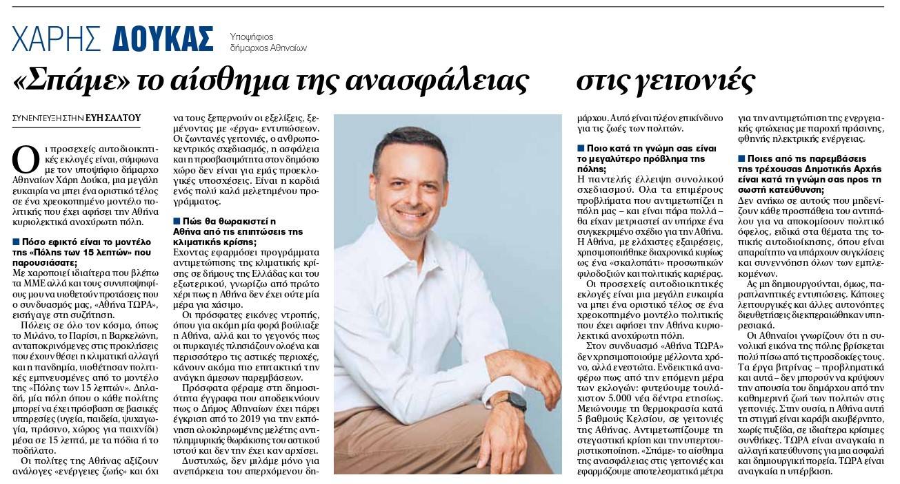 Συνέντευξη του υποψηφίου δημάρχου Αθηναίων Χάρη Δούκα στο ένθετο CityHub της εφημερίδας τα ΝΕΑ.